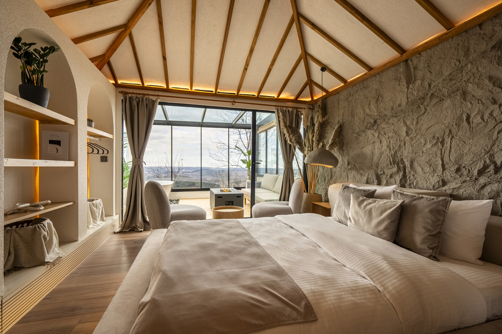 Modern ve lüks tasarımıyla göz kamaştıran odamız, cam terasında bulunan ateş çukuru, hamak ve küvet ile size olağanüstü bir konfor sunuyor. Perdelerinizi çekerek tamamen doğa ve gökyüzüyle bütünleşebilir, güneşli günlerde terasınızı açık balkon olarak kullanarak dışarıdaki güzellikleri kucaklayabilirsiniz. Yağışlı havalarda ise, küvetin keyfini çıkarıp ateş çukurunun etrafında kahvenizi yudumlarken camlardan süzülen damlaların süzülüşünü izleyebilirsiniz.
